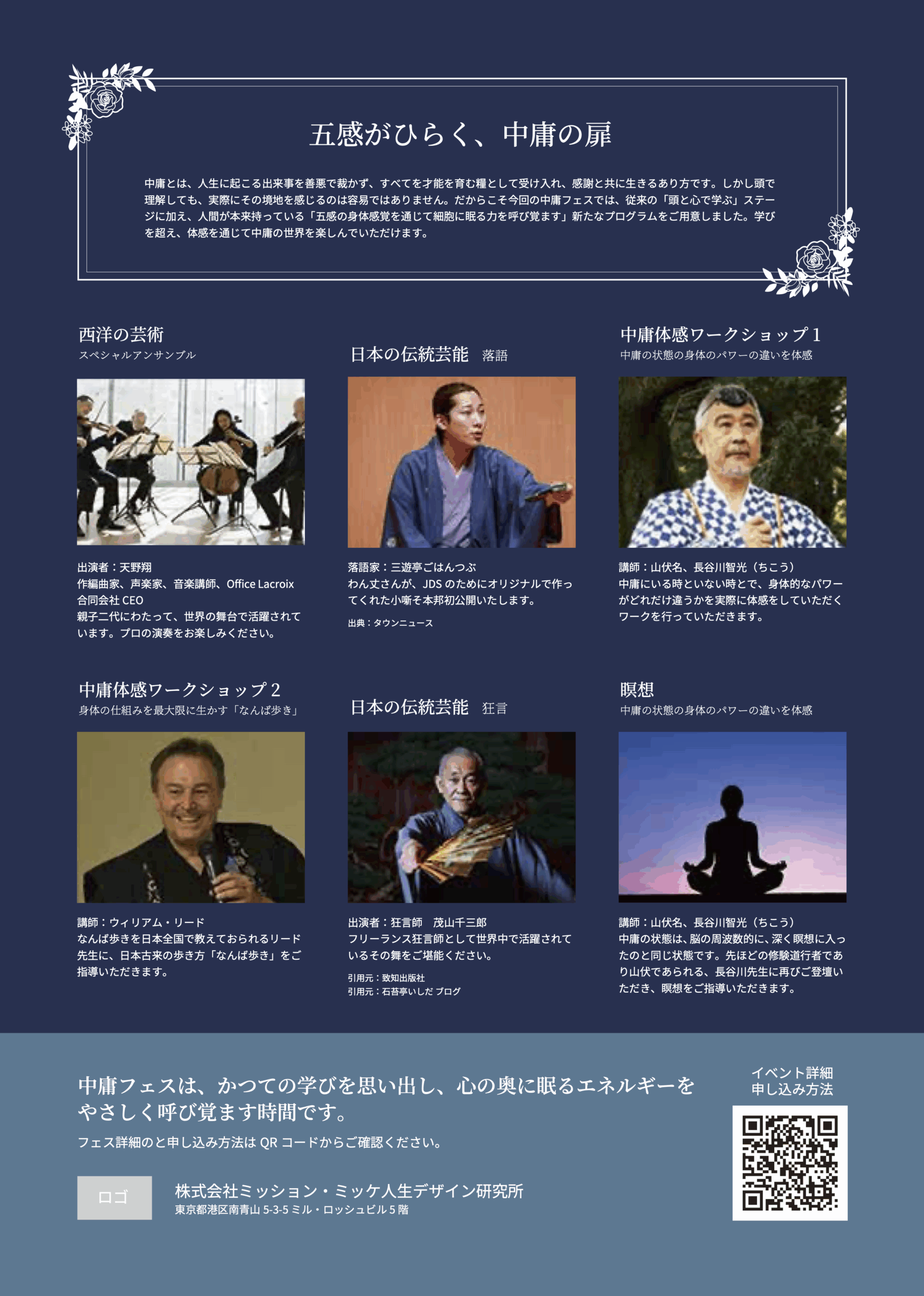 西洋と東洋の響きが交差する音楽、笑いや静寂をもたらす伝統芸能、体を通じたワークショップ――そのすべてが連動し、会場全体を「中庸のエネルギー」で満たしていきます。